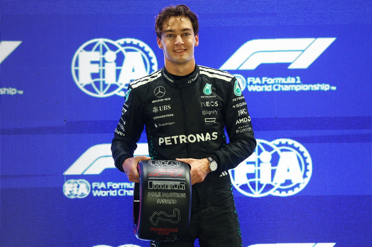 For George Russell, who took pole at the 2025 Singapore Grand Prix, the Pole Position Award has been taken back to Brackley and displayed in the reception of the Mercedes F1 team’s factory.